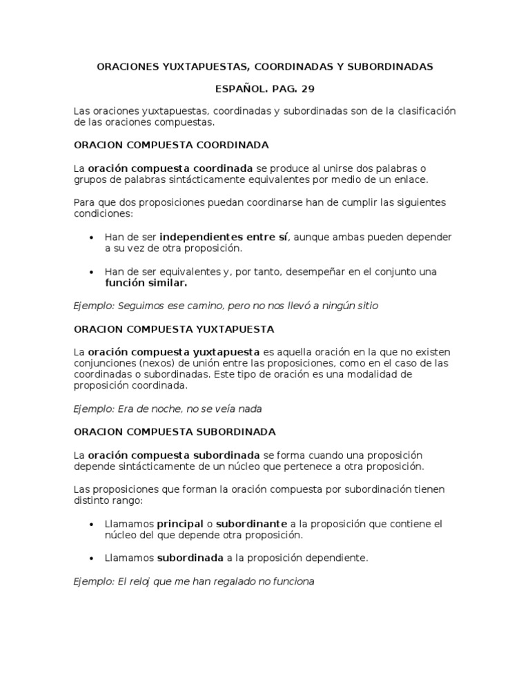 Espanol Oraciones Yuxtapuestas Coordinadas Y Subordinadas Pdf Oracion Linguistica Semantica