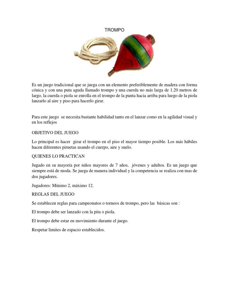 Reglas del juego del trompo. El juego del trompo es un juego tradicional que requiere habilidad cuyo protagonista es un objeto de madera tallada con forma cónica y con una punta aguda de metal llamado trompo y una cuerda no más larga de 120 metros de largo la cuerda o piola o pita o hilo o cabuya se enrolla alrededor del trompo.