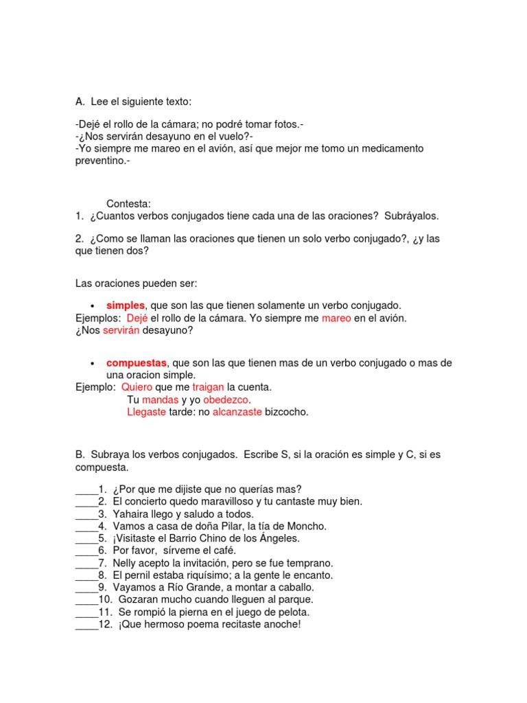 Ejercicios De Verbos Conjugados Y Oraciones Taller De Redaccion 3slv