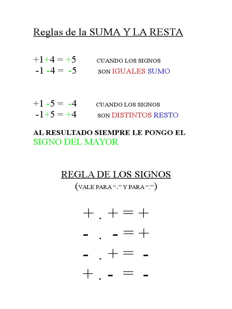Diferencias Entre Reglas De La Suma Y La Resta Y Regla De Los Signos Para Numeros Enteros Pdf