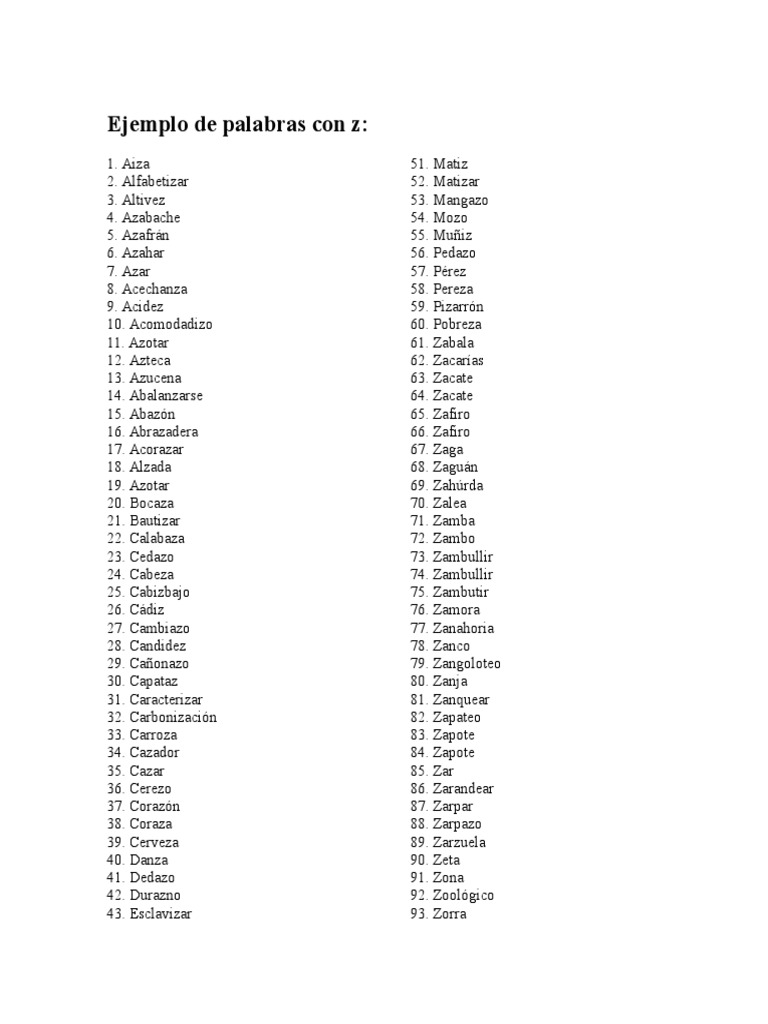 Las reglas ortográficas de la Z. Haz clic aquí para obtener una respuesta a tu pregunta Necesito 25 Palabras Con Z kg3129199 kg3129199 07022019 Baldor Secundaria contestada Necesito 25 Palabras Con Z. La Z es la última letra del alfabetoSi bien en la mayor parte de los países de habla hispana se pronuncia con el mismo sonido que la S en la mayor parte de las zonas de España su sonido es diferentePor ejemplo.