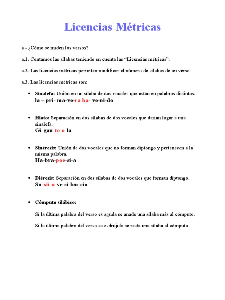 Que son las licencias metricas. Licencias métricas-Se llaman así a los recursos que utiliza el autor para facilitar el cómputo silábicoesto esel recuento de sílabas que tienen los versos. Likewise Cuáles son las licencias metricas más importantes. La sinalefa el hiato la sinéresis y la diéresis.